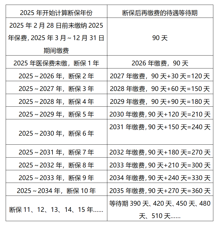 【连续参保理由五】自2025年起,除新生儿等特殊群体外,对未在居民医保集中缴费期内参保或未连续参保的,设置参保后固定等待期90天。其中,未连续参保的,每多断保1年,在固定待遇等待期基础上增加变动待遇等待期30天。